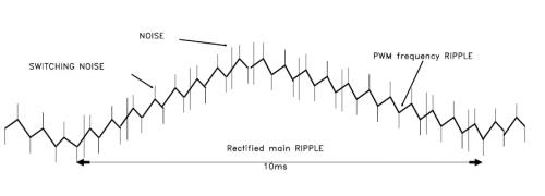 --工頻噪聲(Recfified main RIPPLE),一般是交流供電頻率的兩倍。我國(guó)供電頻率是50Hz,所以它的紋波主要來(lái)自工頻50Hz變壓器。大小取決于整流電路的類(lèi)型。對(duì)于半波整流,50Hz;對(duì)于全波整流,是100Hz;對(duì)于三相全波整流,300Hz。