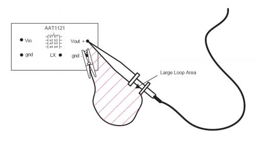 下圖是一個(gè)錯(cuò)誤的測(cè)量方式,因?yàn)槭静ㄆ鞯牡鼐€會(huì)拾取輻射噪聲。示波器的地線和信號(hào)探頭形成的環(huán)路形成了一個(gè)天線。環(huán)路面積越大,在電源PWM切換時(shí),示波器接受到的開(kāi)關(guān)噪聲就越大。