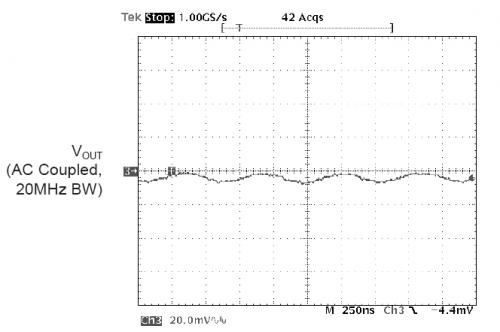 下圖是采用20MHz帶寬限制測(cè)試到的電源的紋波以及噪聲。示波器20MHz的帶寬限制是為了防止無(wú)源探頭帶入的共模噪聲。可以看到AAT1121BUCK轉(zhuǎn)換器的紋波噪聲為10mVp-p,幾乎看不到開(kāi)關(guān)噪聲。這主要是歸功于BUCK控制器的低噪聲設(shè)計(jì),良好的PCB設(shè)計(jì),以及恰當(dāng)?shù)臏y(cè)試方法。