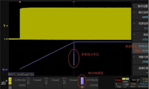 這個時候用ZDS4000系列示波器新開發獨特的占空比趨勢測量功能,將每一個PWM波的占空比顯示在屏幕上,點擊示波器數學運算Math按鍵,模式選擇趨勢圖,類型選擇占空比,示波器會自動檢測PWM波的周期和閾值,無需過多設置,就可以快速出波形,波形如圖5所示。屏幕上除了通道1,還多了MATH通道,顏色為紫色,MATH通道顯示的即是占空比趨勢,可以看到占空比緩慢遞增后大約在屏幕中間位置出現了異常。和通道1一樣,MATH通道也可以調節垂直檔位和偏移。