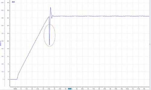 某使用PWM波形驅動的直流電機在加速過程中存在微小抖動情況,觀察電機轉速波形如圖3所示,開始加速后大約在3.6秒轉速出現一個下拉動作。電機PWM調速原理是通過改變接通脈沖的寬度,使直流電機電樞上電壓的占空比改變,從而改變電樞電壓的平均值,控制電機的轉速。因此基本可以確定這個轉速下拉動作是由于PWM波占空比出現異常引起的。