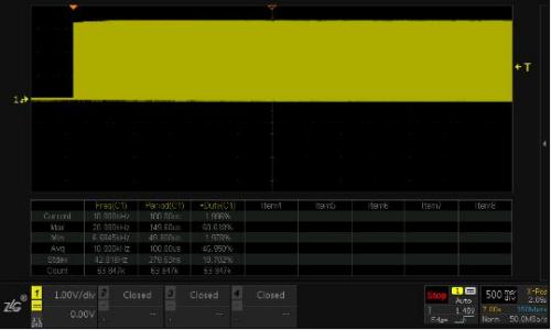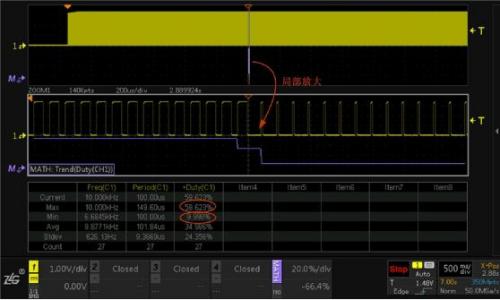 定位到占空比異常位置后,開啟示波器縮放模式下ZOOM多窗口顯示功能,對信號進行局部放大,如圖6所示,可以清晰的看到占空比異常的細節,同時開啟對ZOOM1窗口數據的測量和統計,可以看到占空比從正常的59.62%變為9.99%左右。