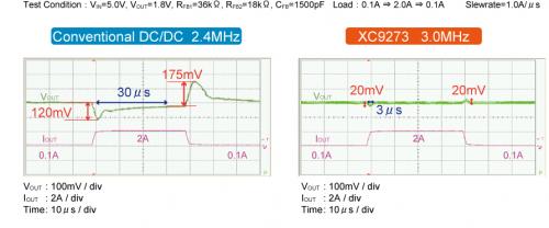 近年來,低耐壓降壓DC/DC轉換器正在成為大市場之一,來自顧客的要求也在持續增加。包括以前獨自研發的快速瞬態響應控制HiSAT-COT (以下簡稱“HiSAT-COT控制”)7系列,XC9273也選用HiSAT-COT控制擴充了產品陣容。