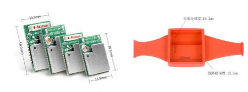 本方案采用廣州致遠研發的低功耗小體積Nano型zigbee模塊,如下圖所示zigbee模塊一般采用陶瓷天線,低功耗模塊體積可以做到13.5mm*16.5mm,放在標準的表帶中剛剛合適如果體積再大就有點放不了。整個模塊采用郵票孔的方式高度正好合適,如果使用排針的方式再算上底板的厚度高度就顯得太高了。