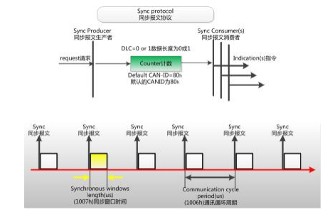 一般同步報文由NMT(網絡管理)主機發(fā)出,CAN報文的數(shù)據(jù)為0字節(jié)。但如果一個網絡內有2個同步機制,就需要設置不同的同步節(jié)拍,比如某些節(jié)點按1個同步幀發(fā)送1次PDO,其他的節(jié)點收到2個同步幀才發(fā)送1此PDO,