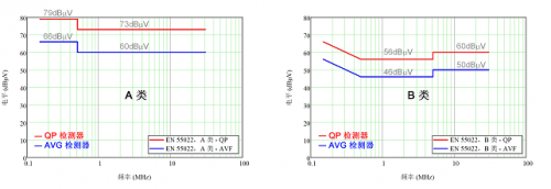 圖 1:使用準峰值和平均值檢測器的 EN 55022 A 類和 B 類傳導發(fā)射限值。