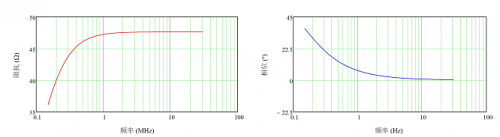 對于使用 EMI 接收器或頻譜分析儀進行的測量,噪聲信號可通過高通濾波器網(wǎng)絡(如圖 3 所示)獲得,該網(wǎng)絡的耦合電容為 0.1μF,放電電阻為 1kΩ,測量端口的端接電阻為 50Ω 。圖 4 顯示了在 150kHz 至 30MHz 的頻率范圍,(50μH + 5Ω) || 50Ω LISN 的模擬阻抗圖。