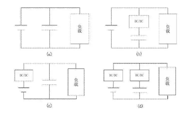 與超級(jí)電容配合使用的DCDC,在整車(chē)電源中的位置如下圖所示,它可能出現(xiàn)在圖(b)、(c)、(d)中所示位置上,而(b)是應(yīng)用較多的一種形式。