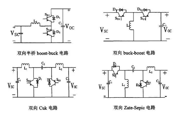 非隔離雙向DCDC,結(jié)構(gòu)比較簡(jiǎn)單,每個(gè)部件都是直接相連,沒(méi)有額外的能量損失,工作效率比較髙。對(duì)升壓側(cè)的電容要求比較高。主要的非隔離DCDC電路結(jié)構(gòu)有雙向半橋boost-buck電路,雙向buck-boost電路,雙向buck電路,雙向Zate-Sepic電路,如下圖所示。