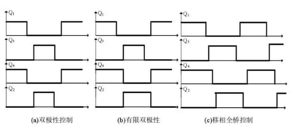 進(jìn)一步的,軟開(kāi)關(guān)包括三種控制方式:雙極性控制,有限雙極性控制,移相全橋控制,得到的矩形波波形如下圖所示。